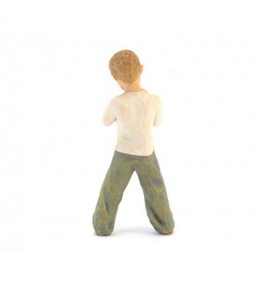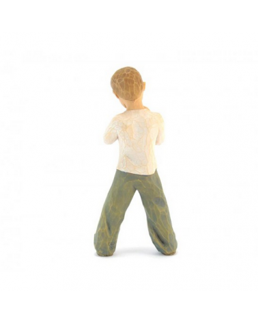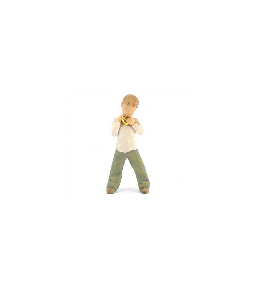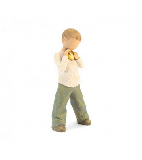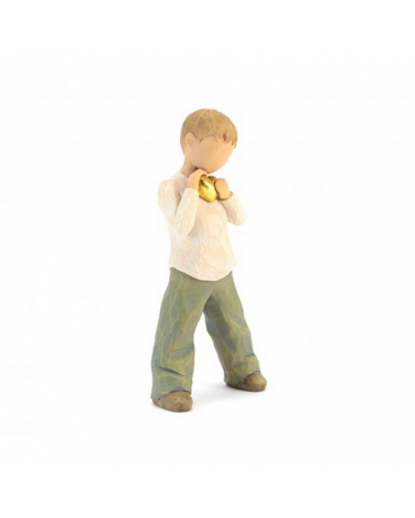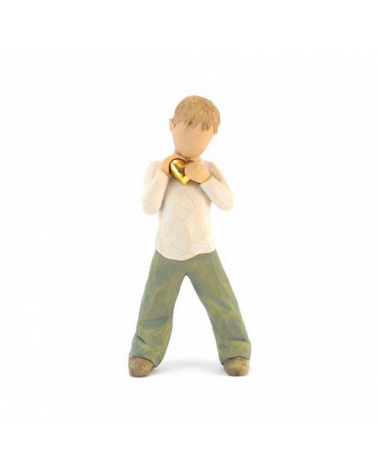 Statue "Heart of Gold", representing a boy holding a golden heart in his hands, made of hand painted resin, wood style. Willow Tree Collection by the artist Susan Lordi. Packed in their original box with certificate of warranty.
