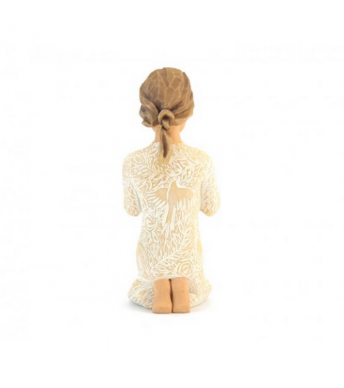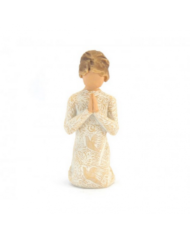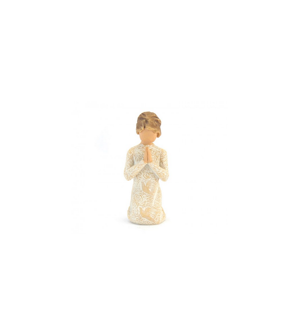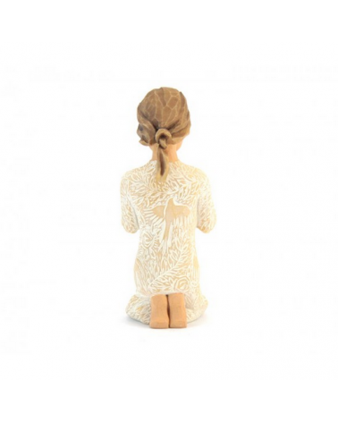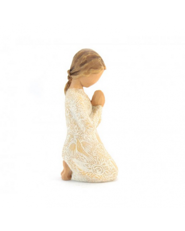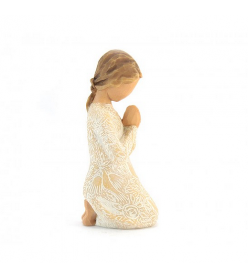 Statue "Prayer of Peace", representing a girl kneeling down, praying for peace, made of hand painted resin, wood style. Willow Tree Collection by the artist Susan Lordi. Packed in their original box with certificate of warranty.