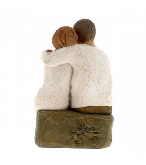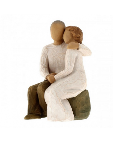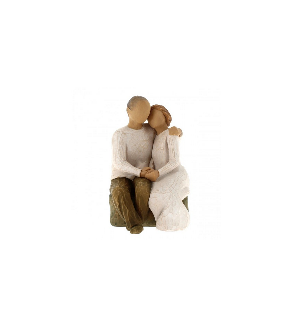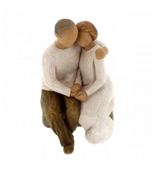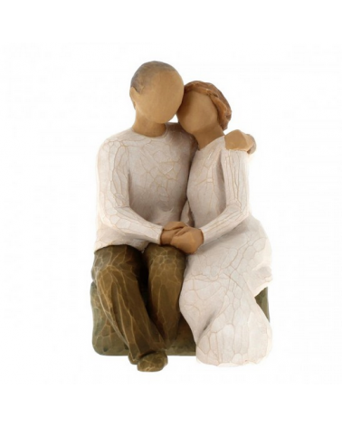 A wonderful Anniversary figure depicting a couple holding hands, made of resin with wood effect, designed by the artist Susan Lordi for the Willow Tree collection, ideal as favour or gift.
